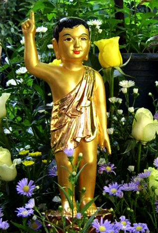 부처님께서 룸비니동산에서 탄강하셨을 때 태어나자마자 사방으로 일곱 걸음 걸으시며 오른손은 들어 하늘을 가리키고 왼손은 내려 땅을 가리키면서 "천상천하 유아독존 삼계개고 아당안지(天上天下 唯我獨尊 三界皆苦 我當安之)" 라고 외쳤던 데에서 유래한 수인입니다. 해마다 부처님 오신 날을 맞이하여 봉축법요식을 할 때 관욕단(灌浴壇)을 마련하여 탄생불을 모시고 관불(灌佛)의식을 합니다.
